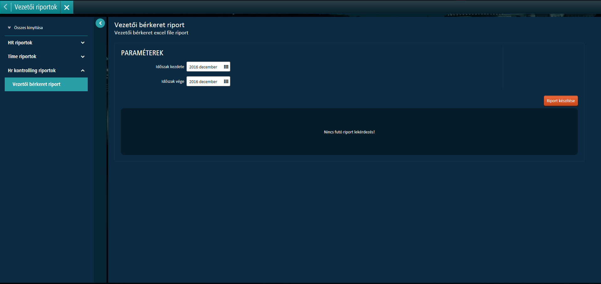 A portál menüben a Vezetői riportok ikon választását követően, a megjelenő képernyőn a Vezetői juttatás riport sort jelölve, majd a Riport készítése gombra való kattintással indítható el a lista.