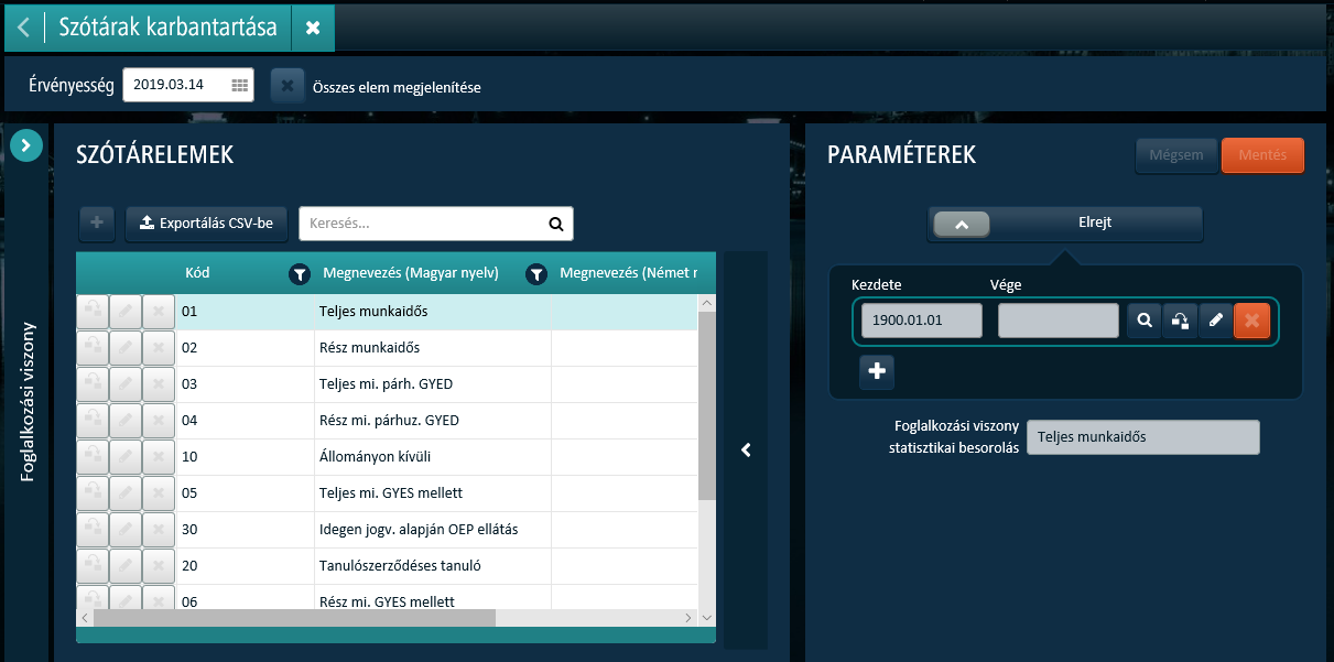 A Foglalkozási viszony statisztikai besorolás a Foglalkozási viszony szótárparaméterében adható meg:
