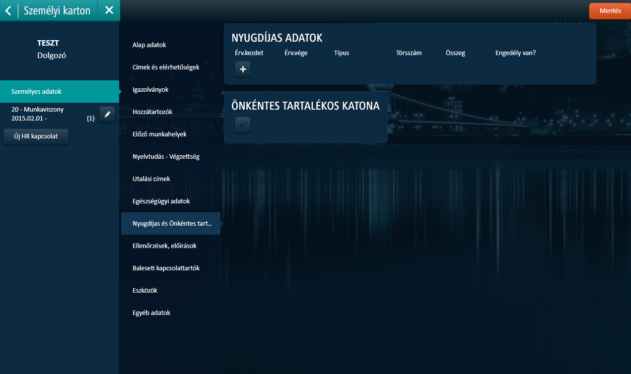 Az alábbi adatkörök és adatok tarthatóak karban a Munkavégzésre irányuló típusú HR kapcsolatra vonatkozóan (lásd "Munkavégzésre irányuló HR kapcsolatok" beállítást).